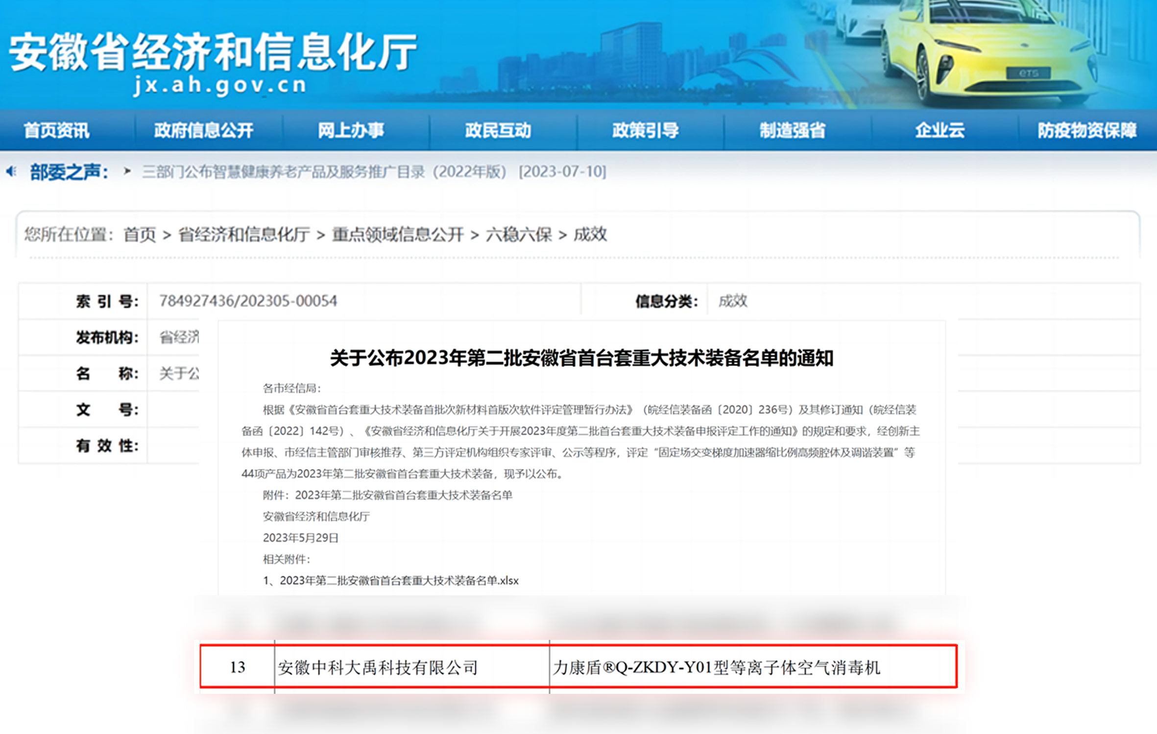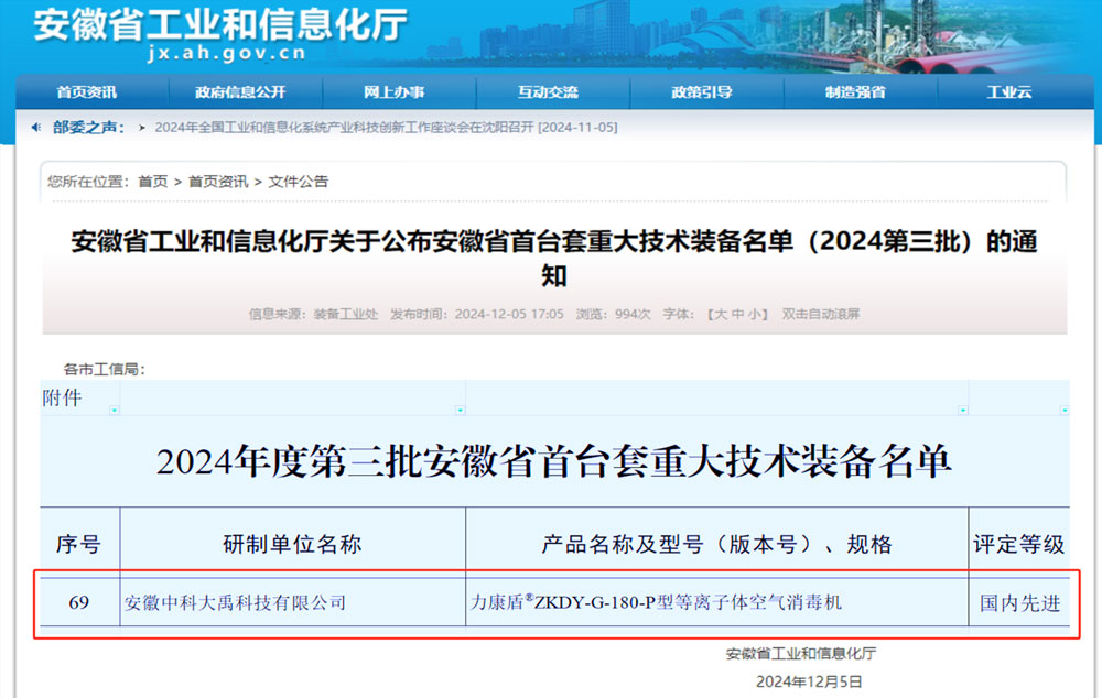 力康盾?ZKDY-G-180-P型等離子體空氣消毒機(jī)入選2024年度第三批安徽省首臺(tái)套重大技術(shù)裝備,評(píng)定等級(jí):國內(nèi)先進(jìn)